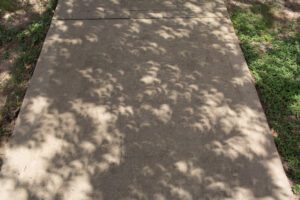 Shadow of solar eclipse on the sidewalk through tree leaves and branches.